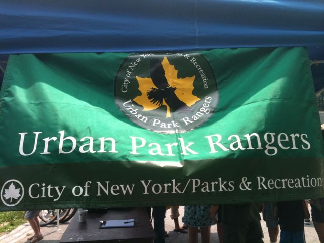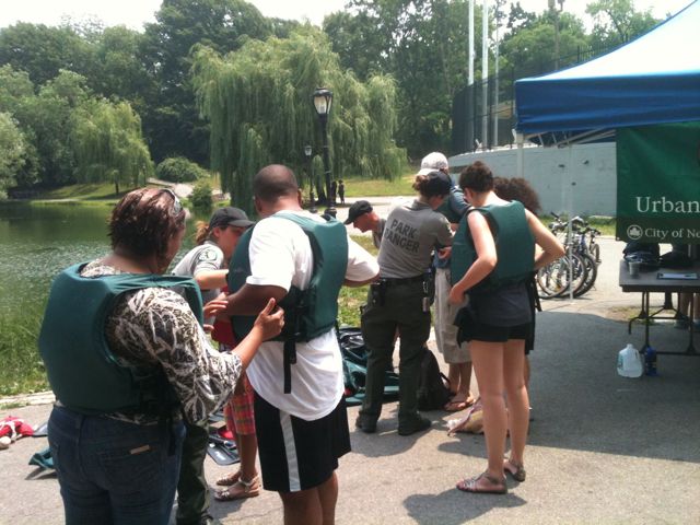Walking along Central Park North on Sunday, I discovered several red canoes in the pond at Harlem Meer. I wonder what was up…so I headed on over to Lasker Rink where there was a sign-in desk. There I saw New York City Urban Park Rangers helping people put on life jackets, placing them in a canoe and pushing them off into the pond at Harlem Meer. Urban Park Rangers were offering free canoeing all day on June 27 from noon until 3 PM. New York City Department of Parks and Recreation offer it every summer on select Sundays. One of the Park Rangers on site said to check the schedule online regularly to see when they’re offering free canoeing again. The Park Ranger said it will happen again soon! There is free canoeing offered about three or four times throughout the summer. How fun! I am going to try it!