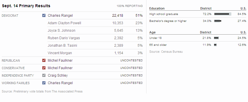 Harlem NY Primary Election Results HarlemGuy September 16, 2010 Posted in Harlem, Politics By HarlemGuy Source: The New York Times Click here for full coverage. Author: HarlemGuy